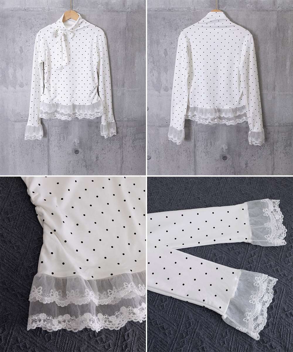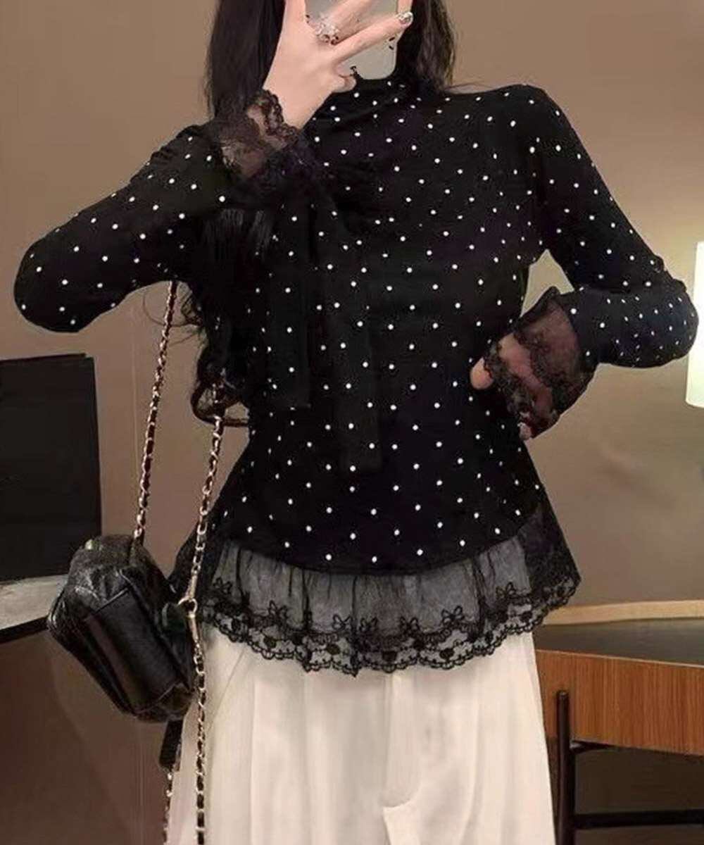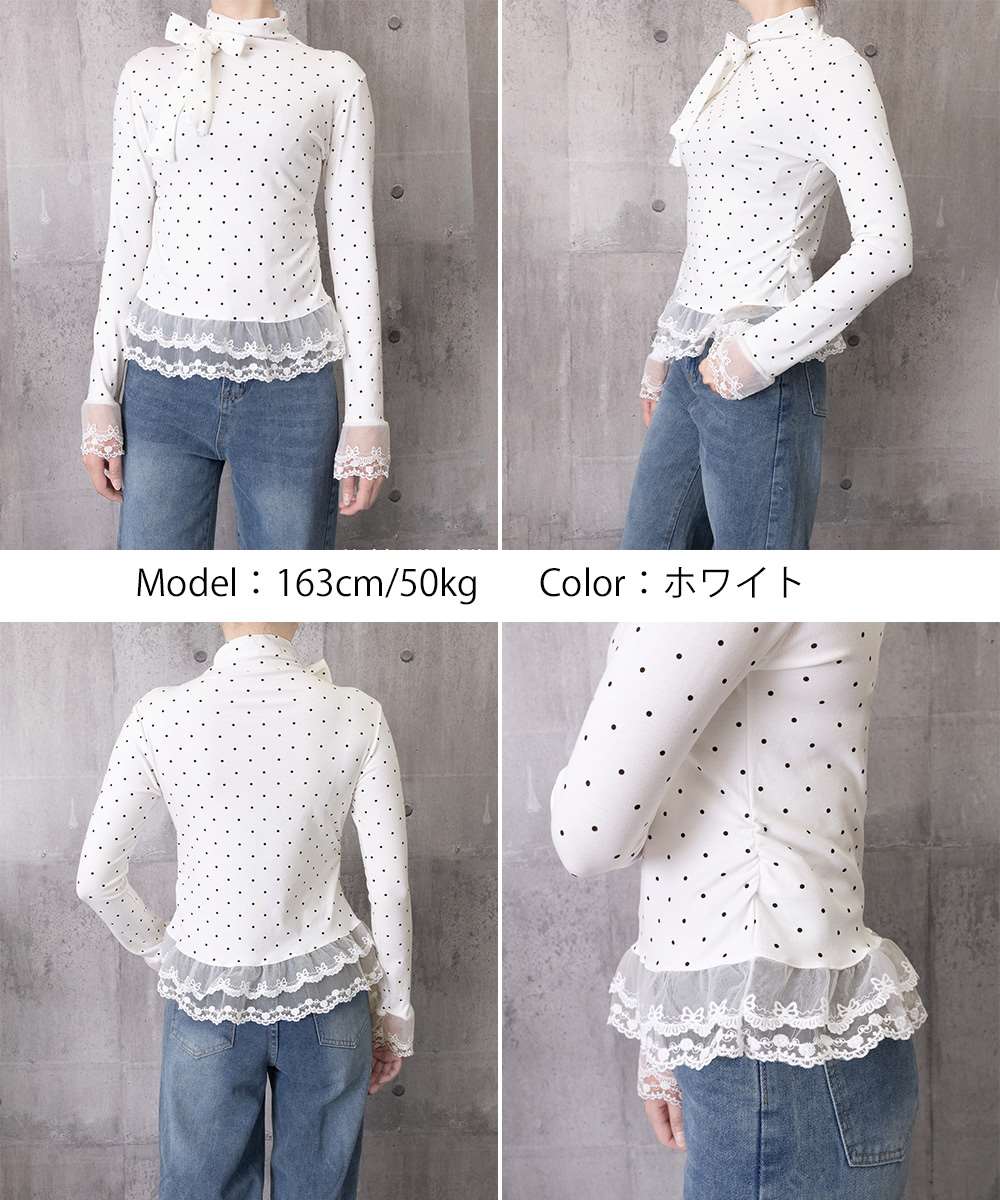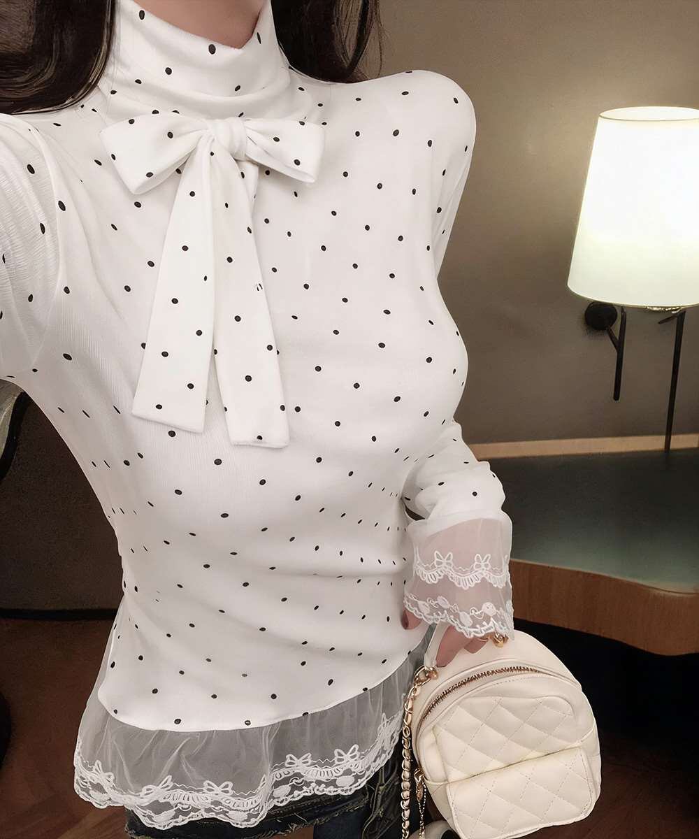 ドット柄とリボンディテールが目を引く、レース切り替えのハイネックトップス。