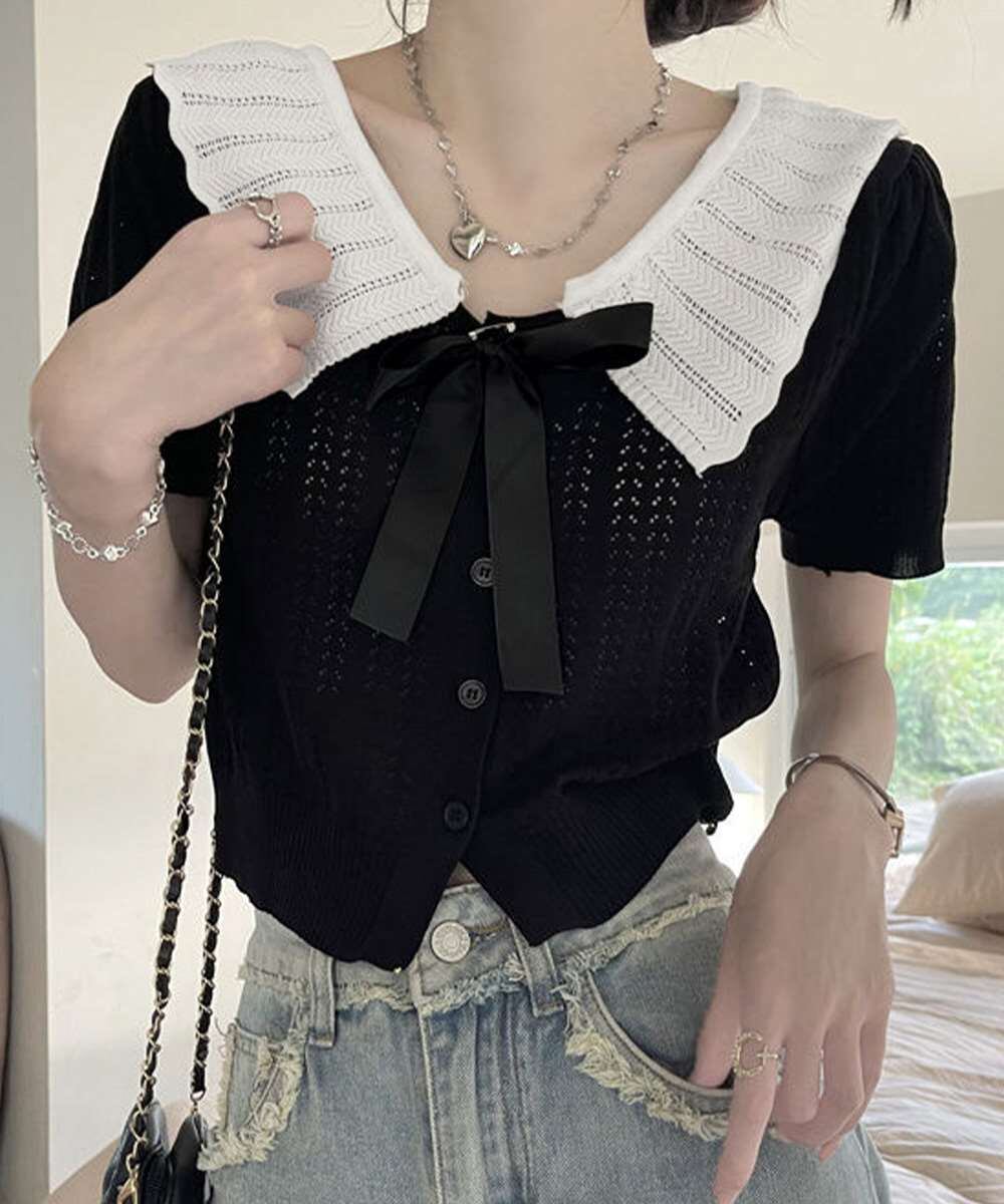 取り外し可能なリボンチャーム付き、可愛めにもきれいめにも着こなせる一枚。