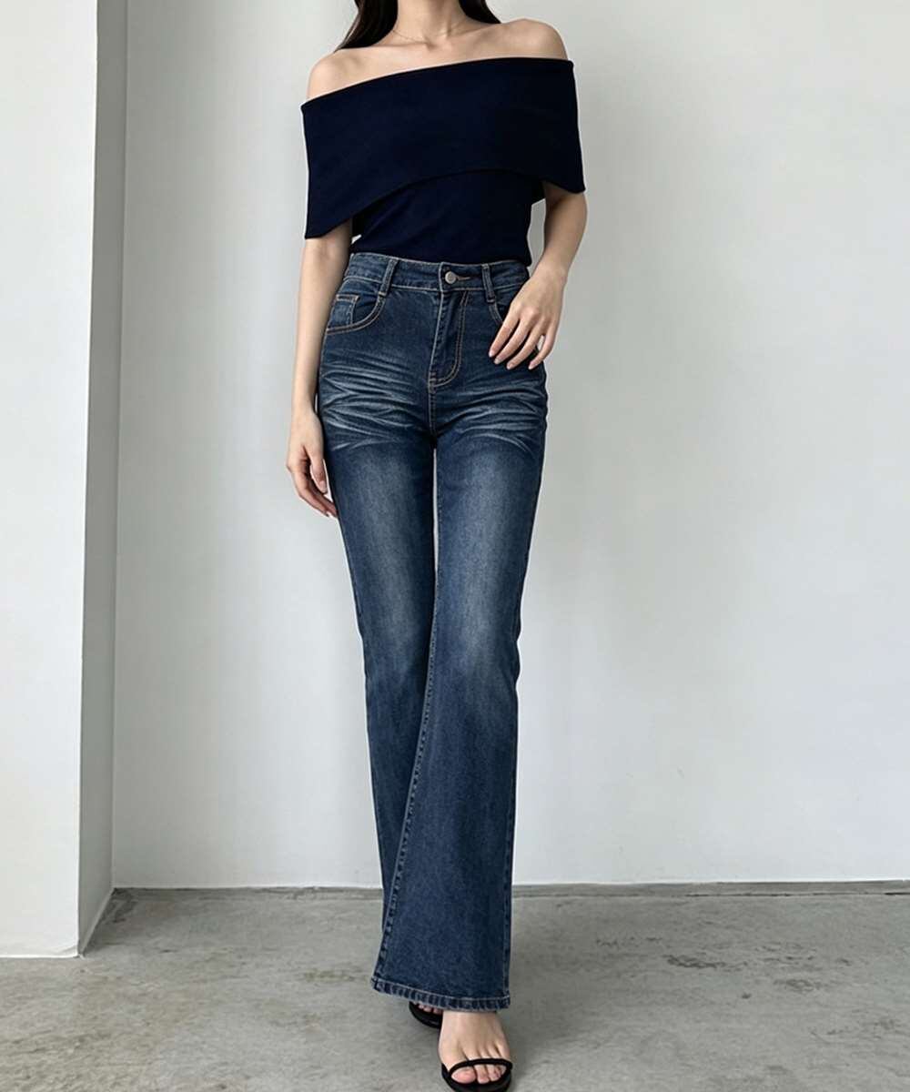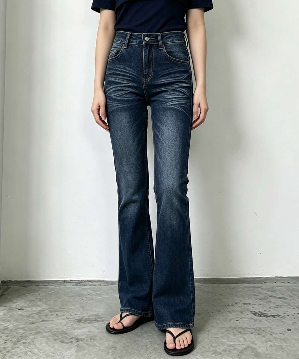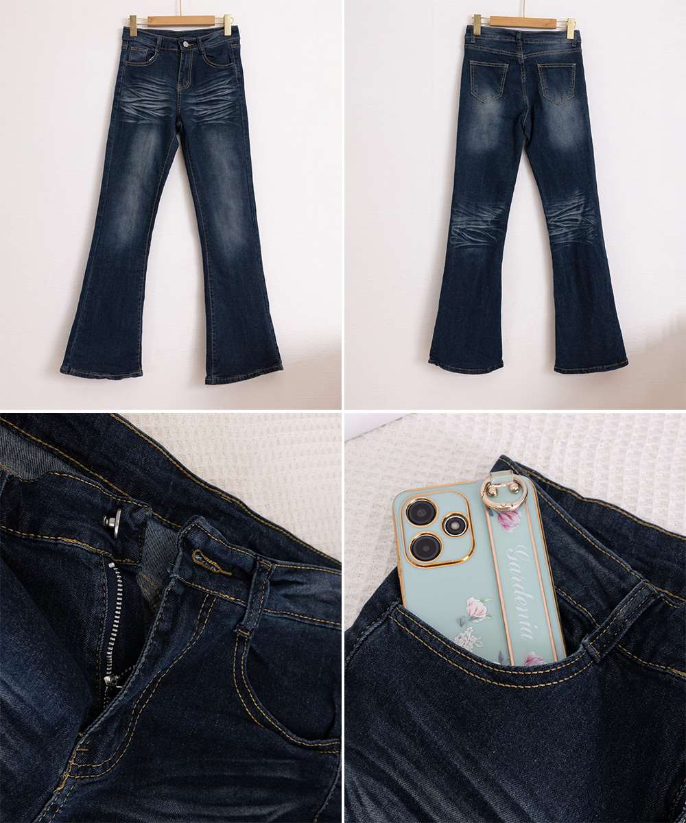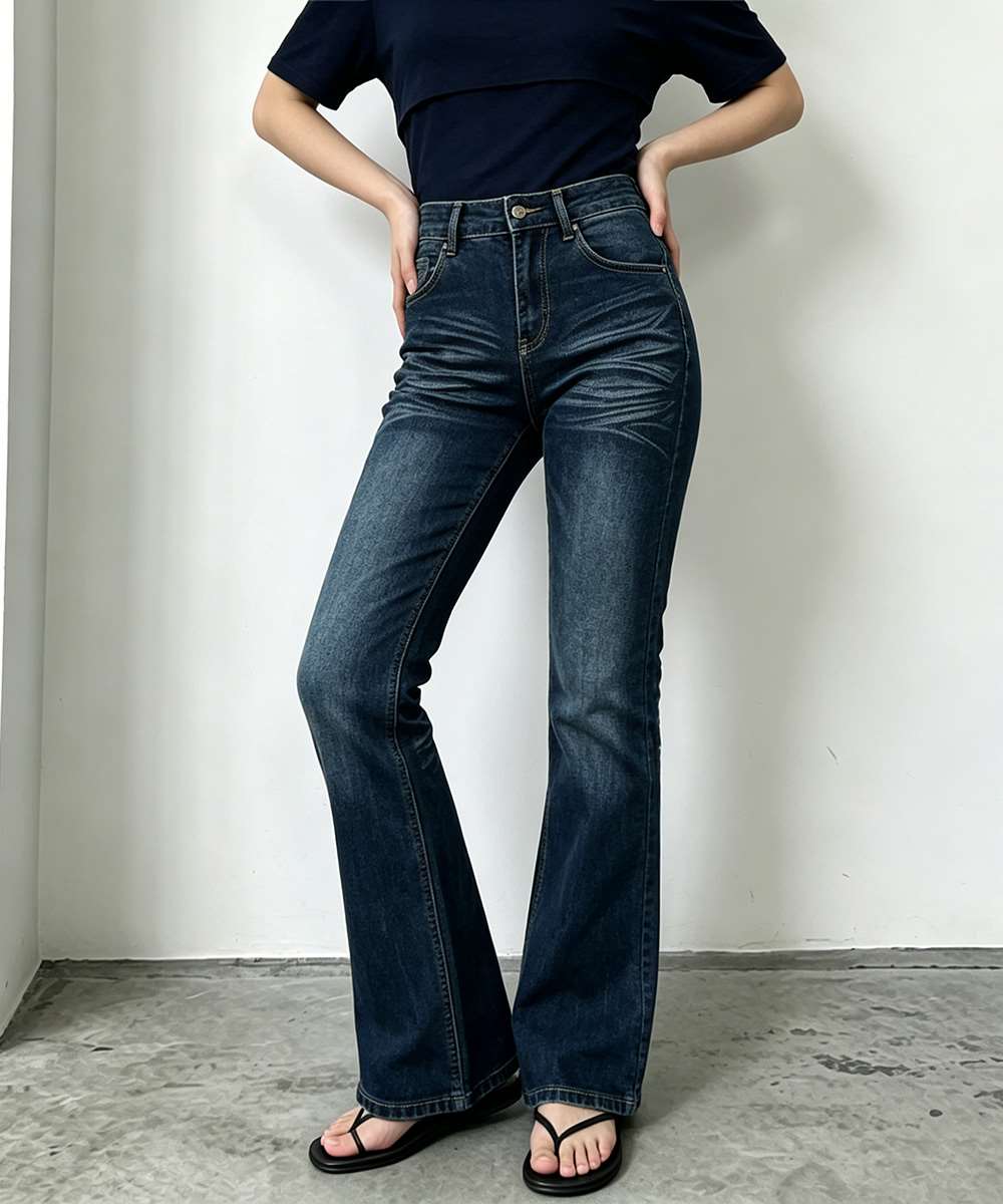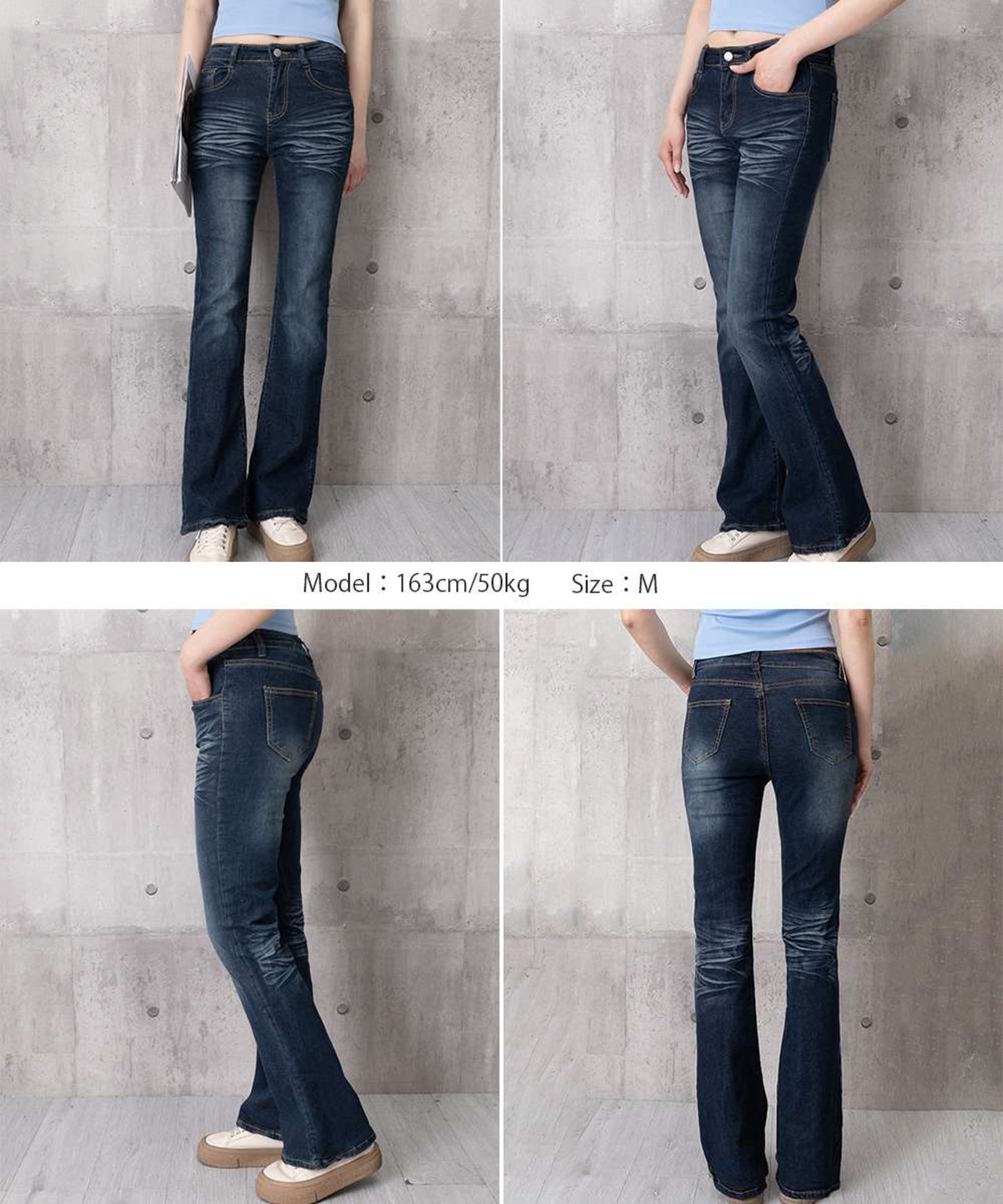 ローライズ仕様とマイクロフレアシルエットで脚を長くすっきり見せるデザイン。