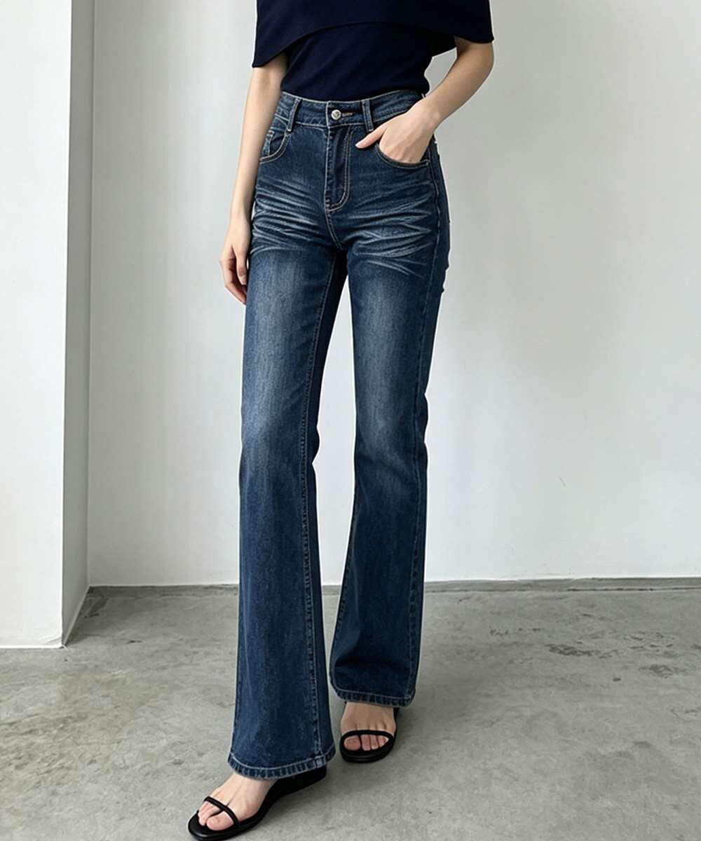 ウォッシュ加工を施したデニムが馴染んだ雰囲気を演出するフレアデニムパンツ。