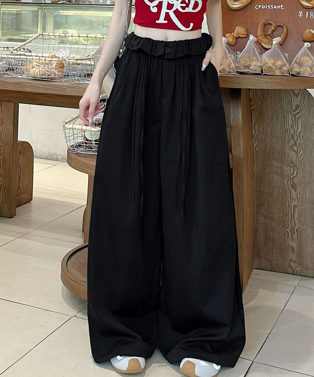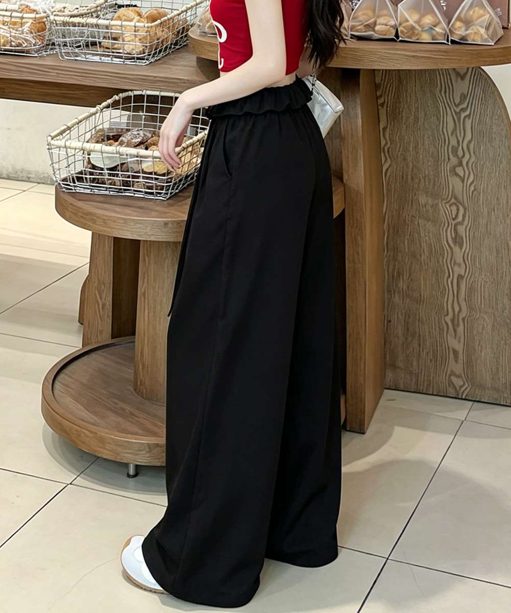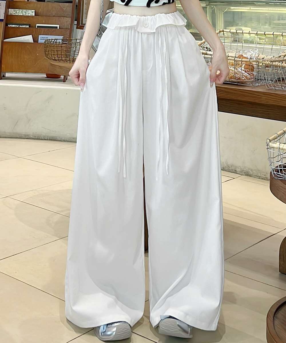 ウエストフリルで大人の抜け感をプラスするワイドパンツ。