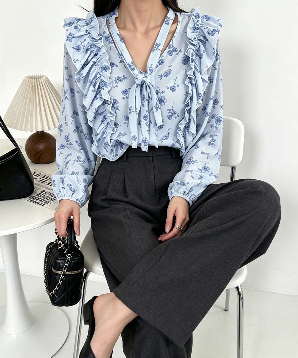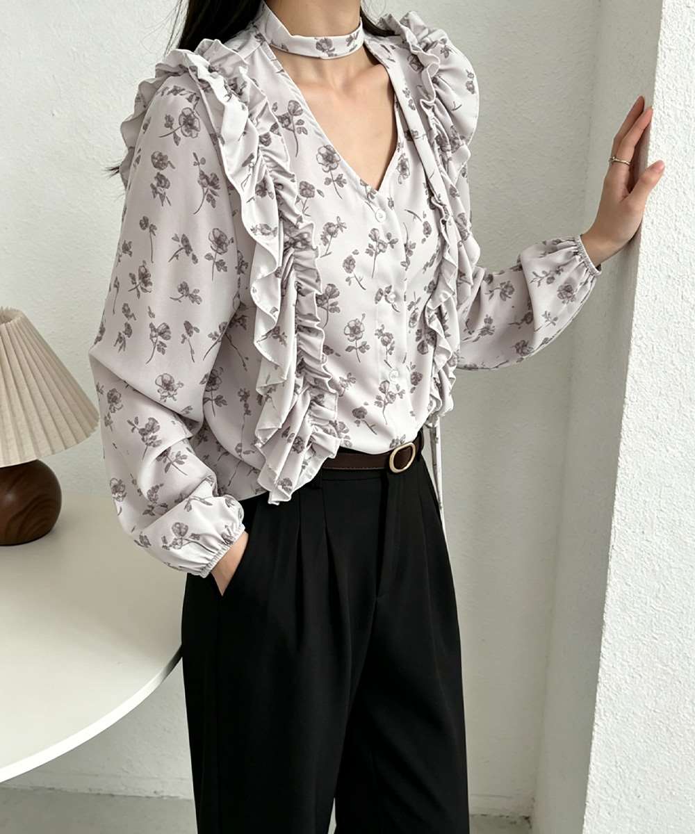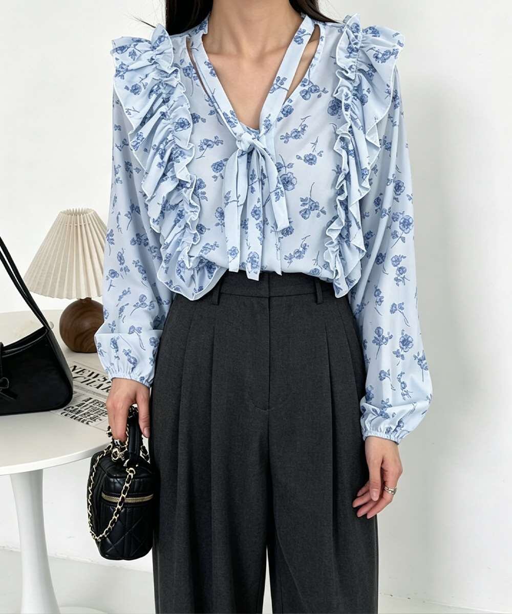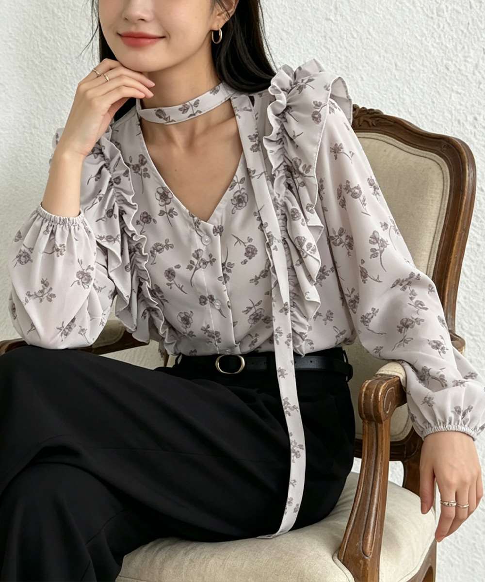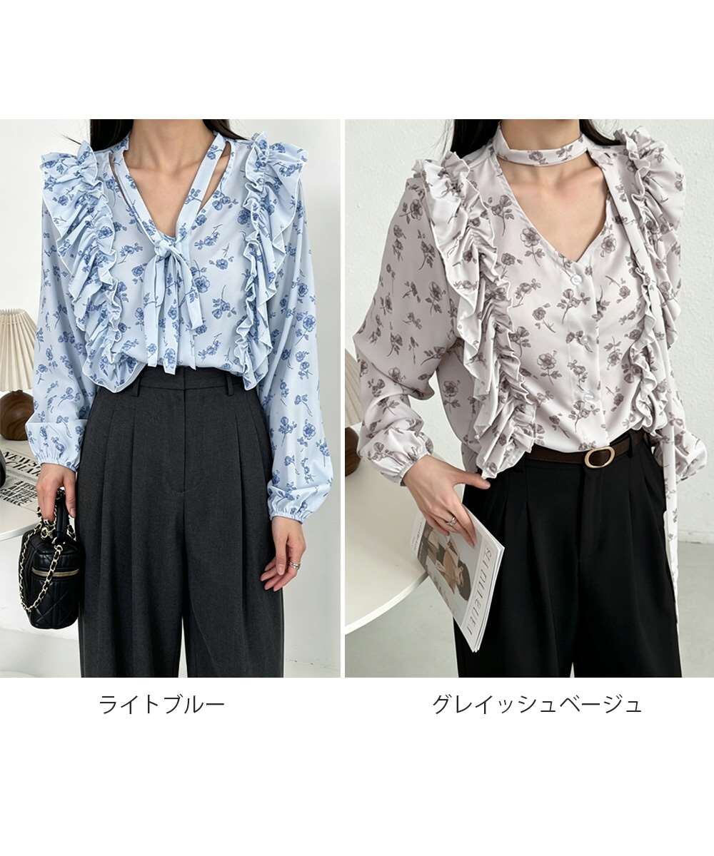 フリル 花柄 シャツ ブラウス リボンタイ付き