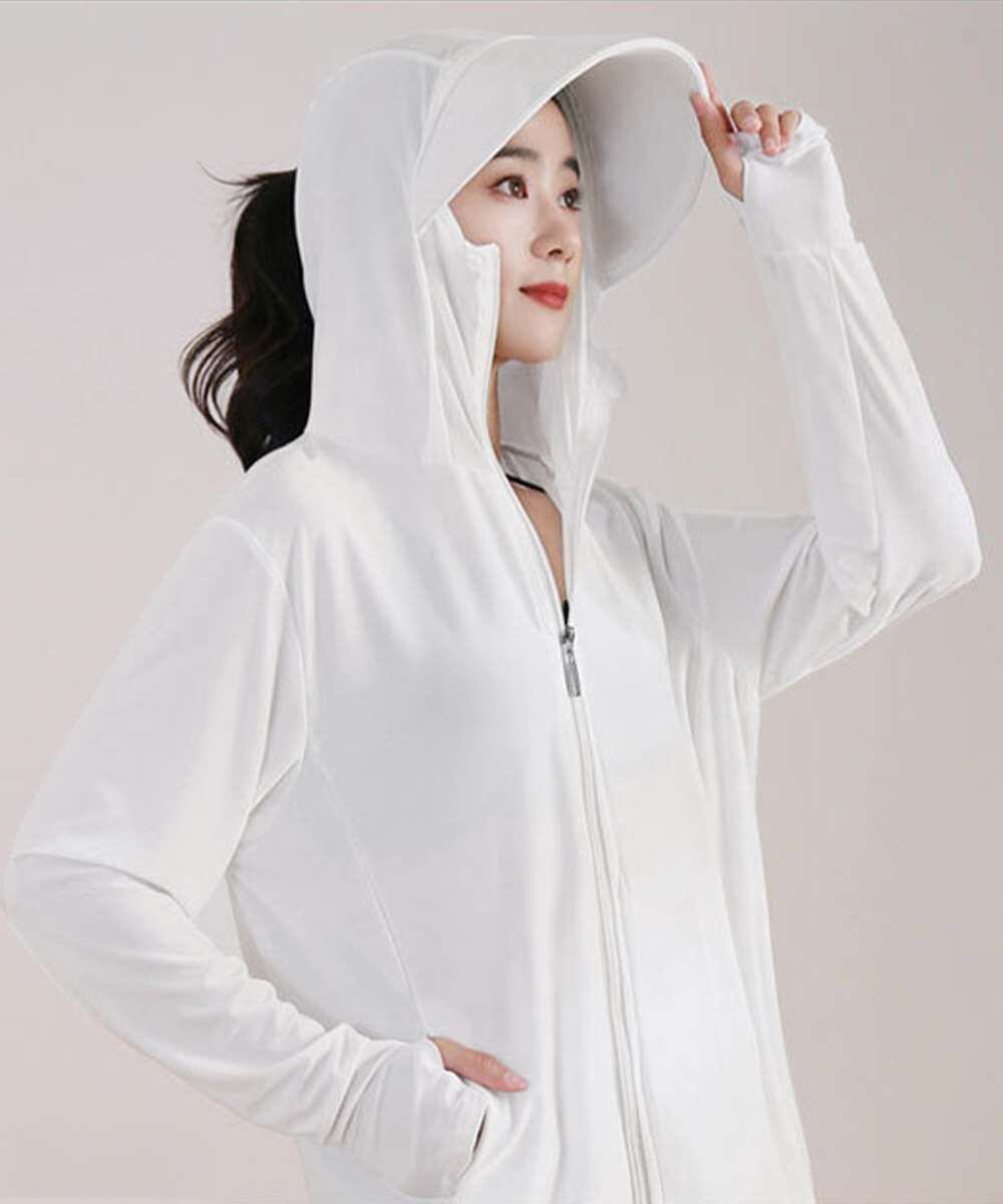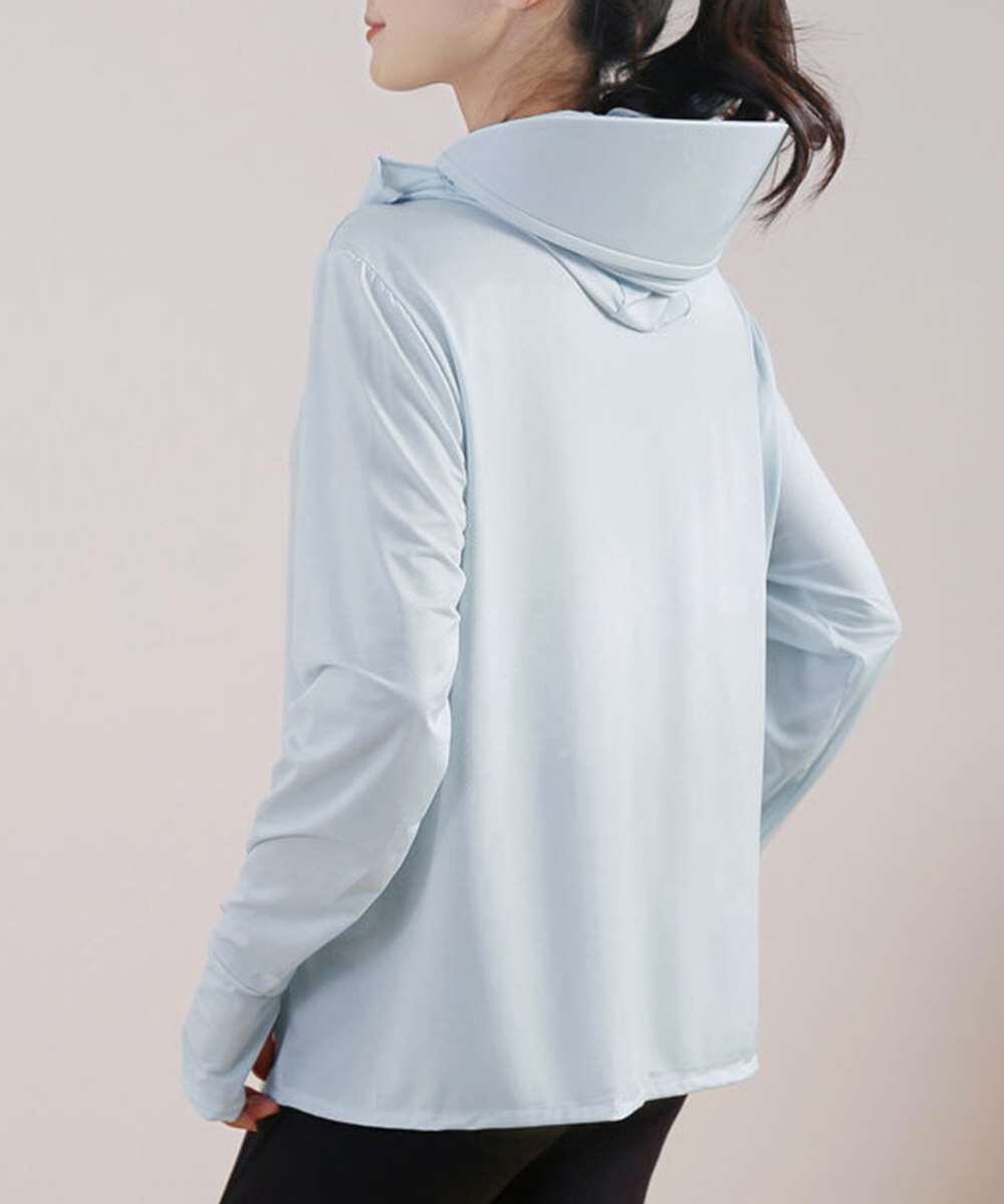 サンバイザー付きのつば広フードで、顔周りから首元までしっかりカバー。さらに指穴付きの袖口で、手の甲までしっかり日焼けを防止します。