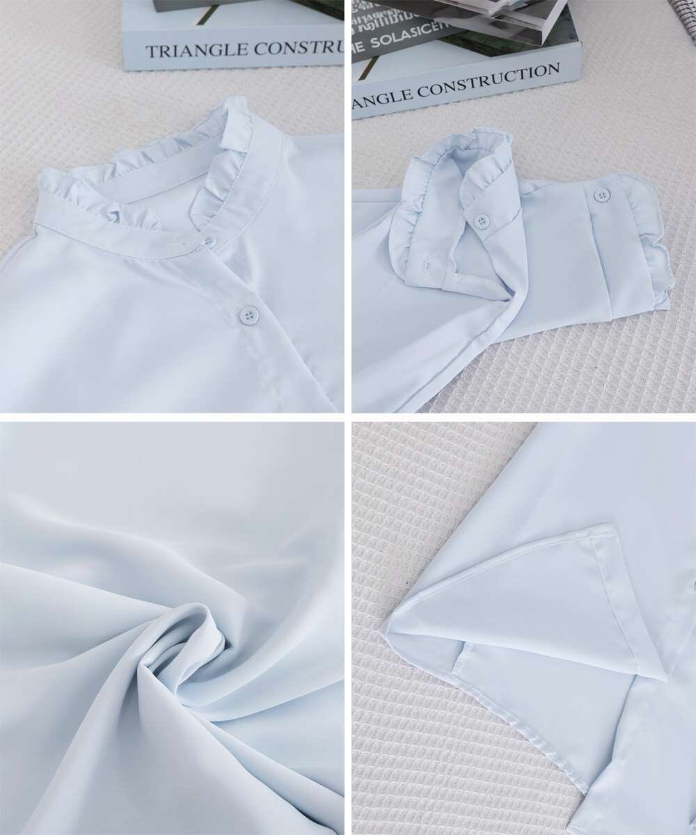 襟元と袖口のフリルが女性らしさを演出し、前開きボタン仕様で着脱もスムーズ。