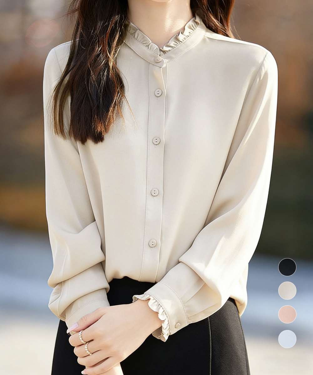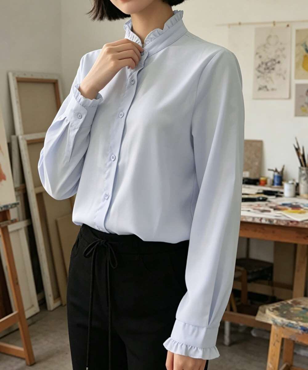 プチハイネックデザインが上品な印象を引き立てるブラウス。