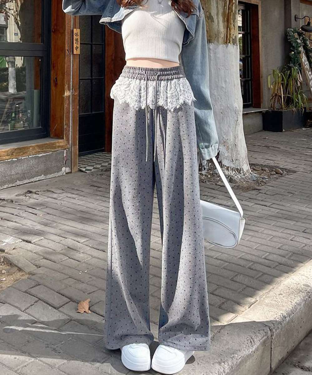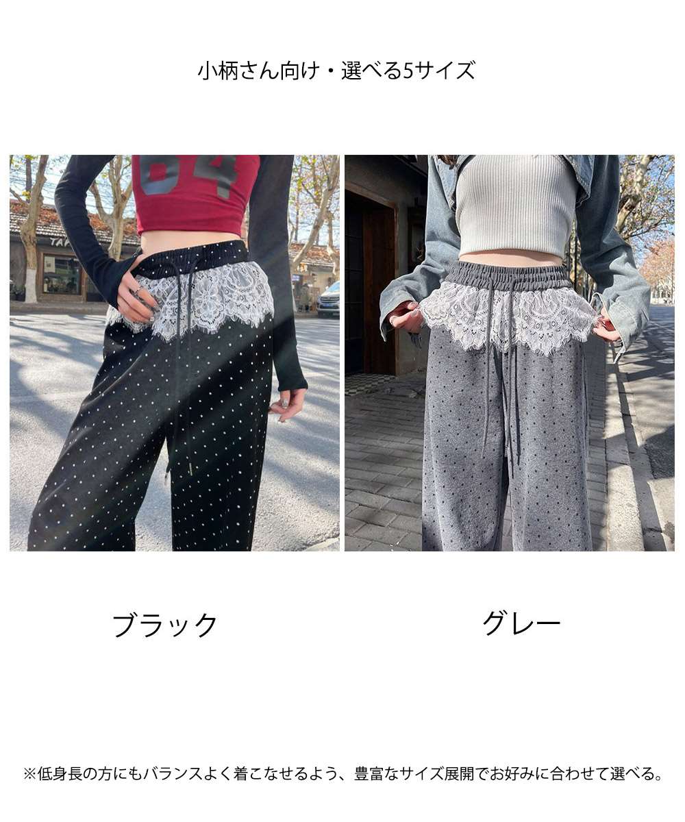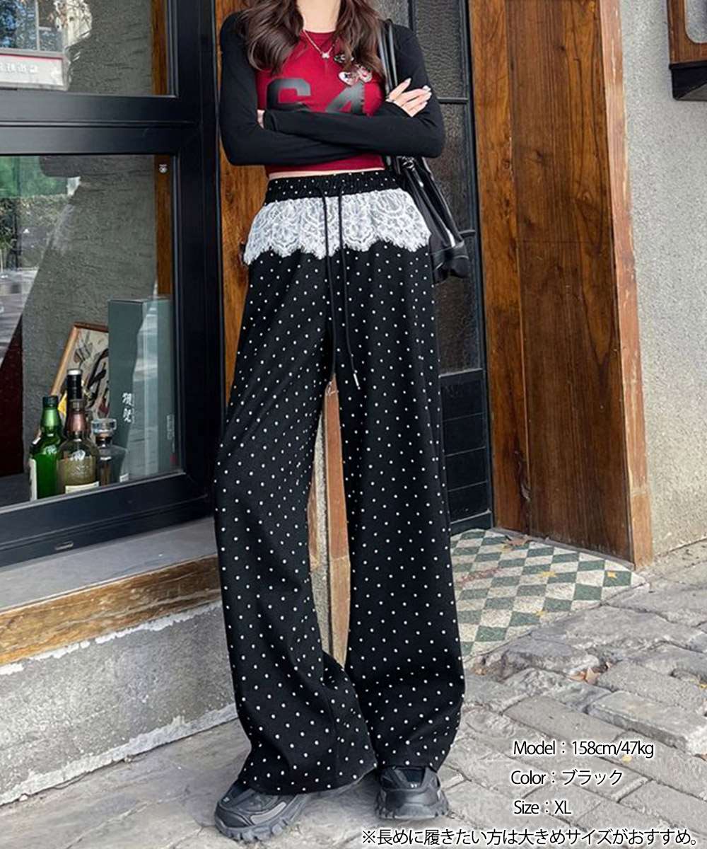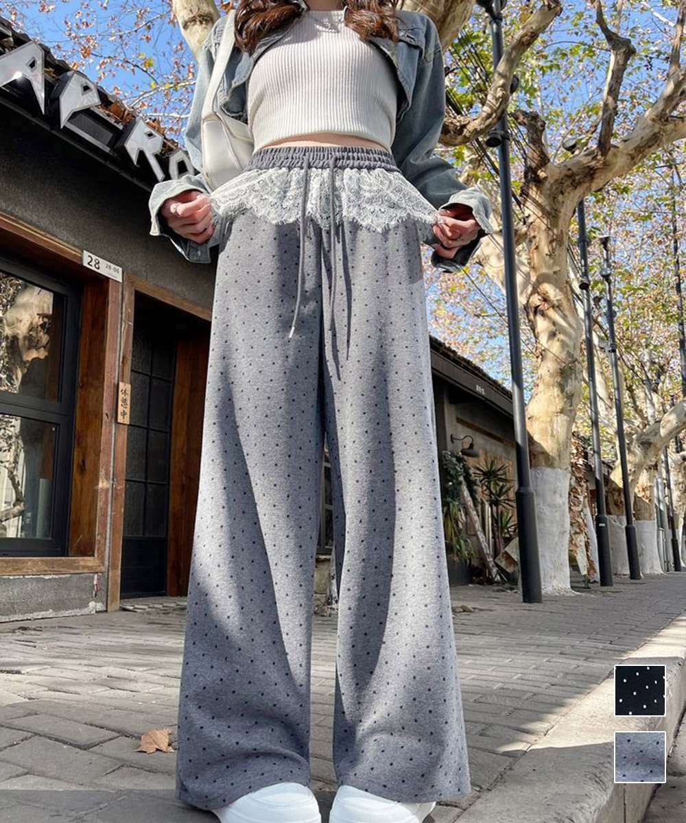 レース切り替え ドット柄 ワイド パンツ 美脚