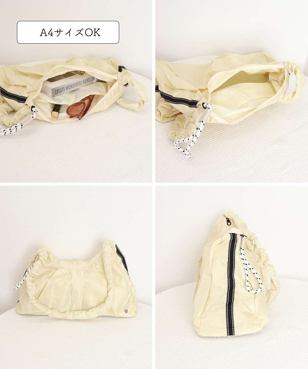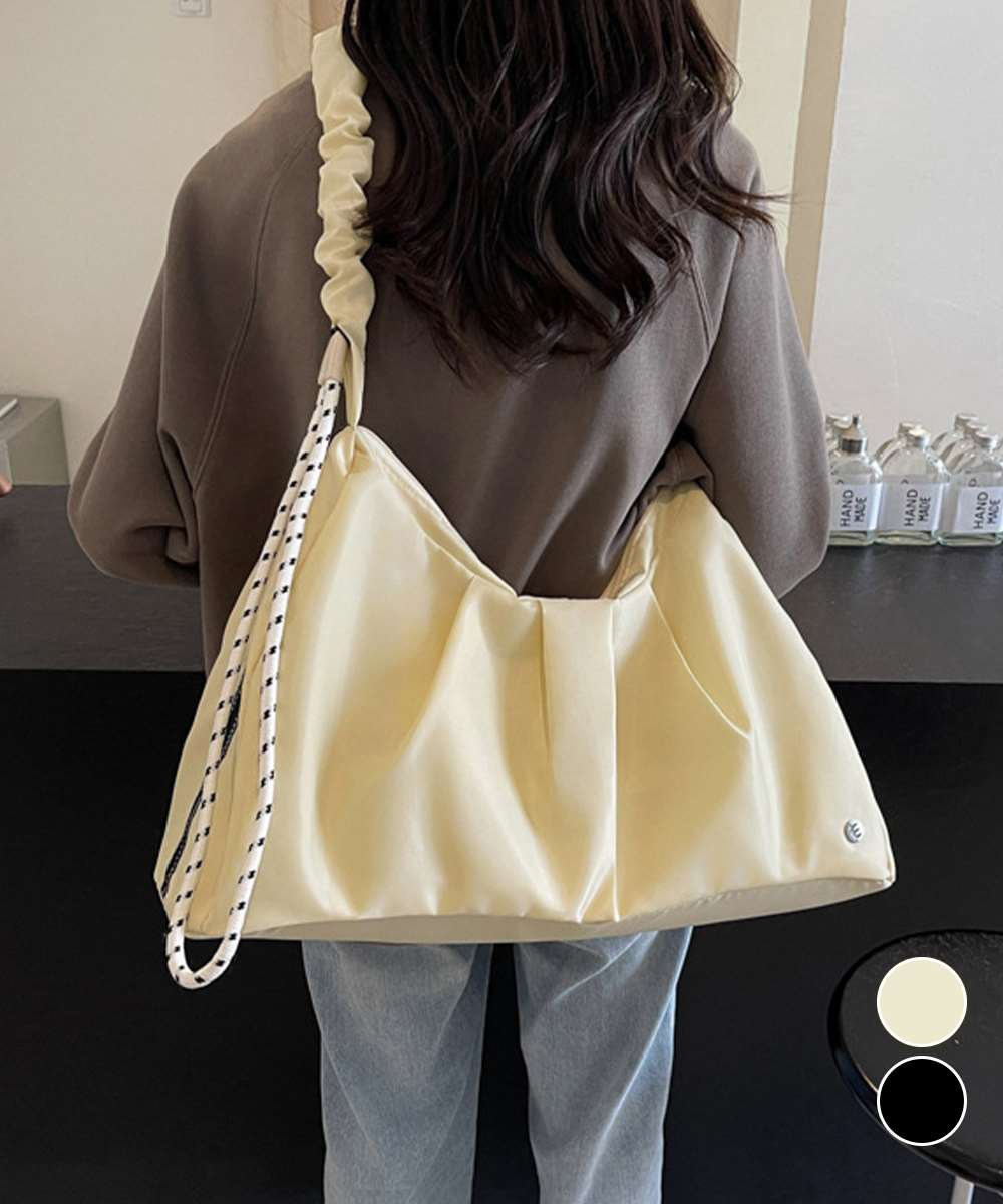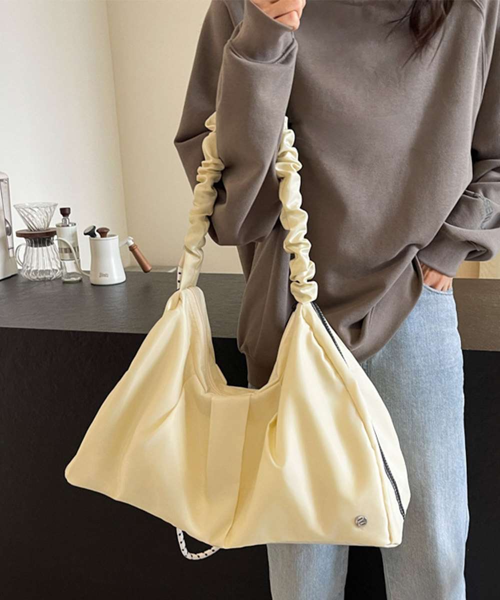 くしゅっとしたギャザーハンドルと、柔らかく落ちるシルエットが印象的なショルダーバッグ。