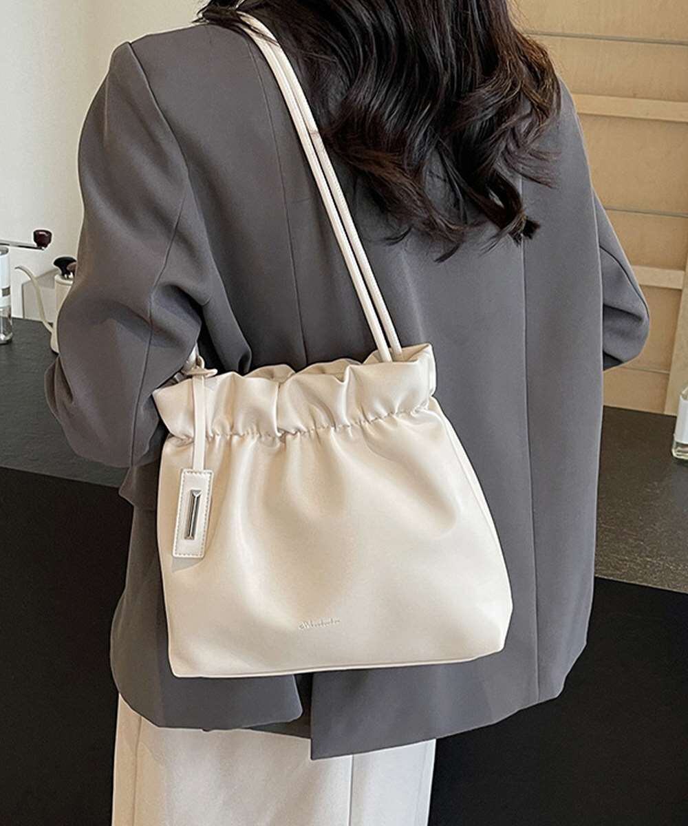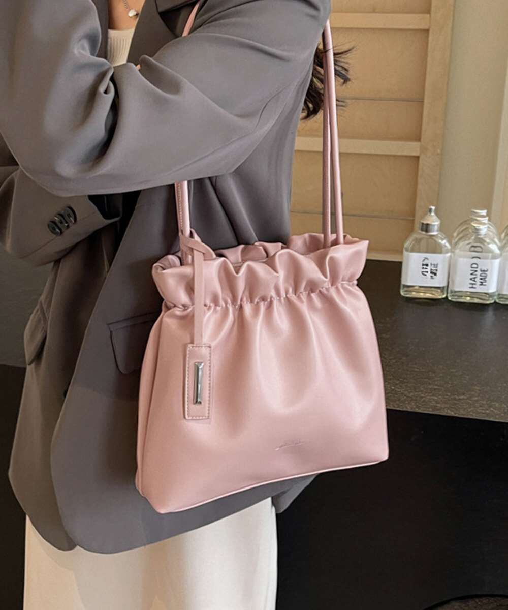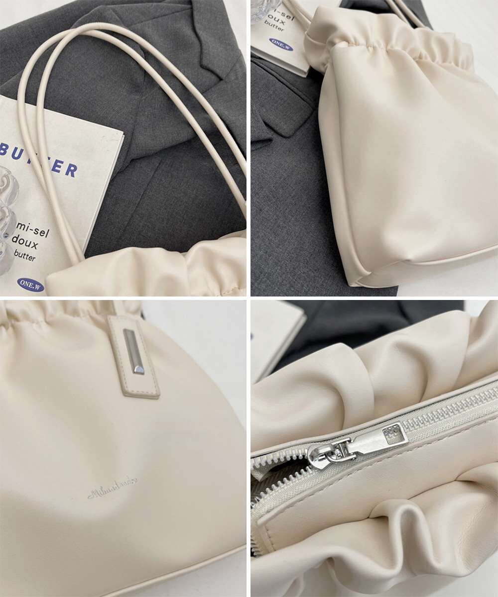 やわらかなフェイクレザーを使用した、ギャザーデザインのショルダーバッグ。