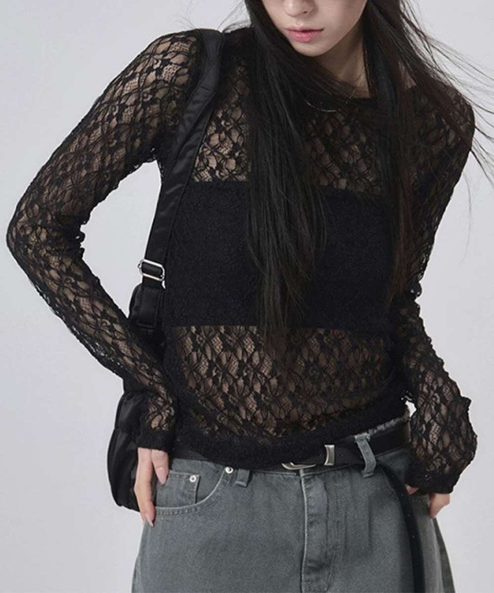 繊細な花柄レース素材が抜け感を引き立てる、フェミニンなシアー長袖トップス。