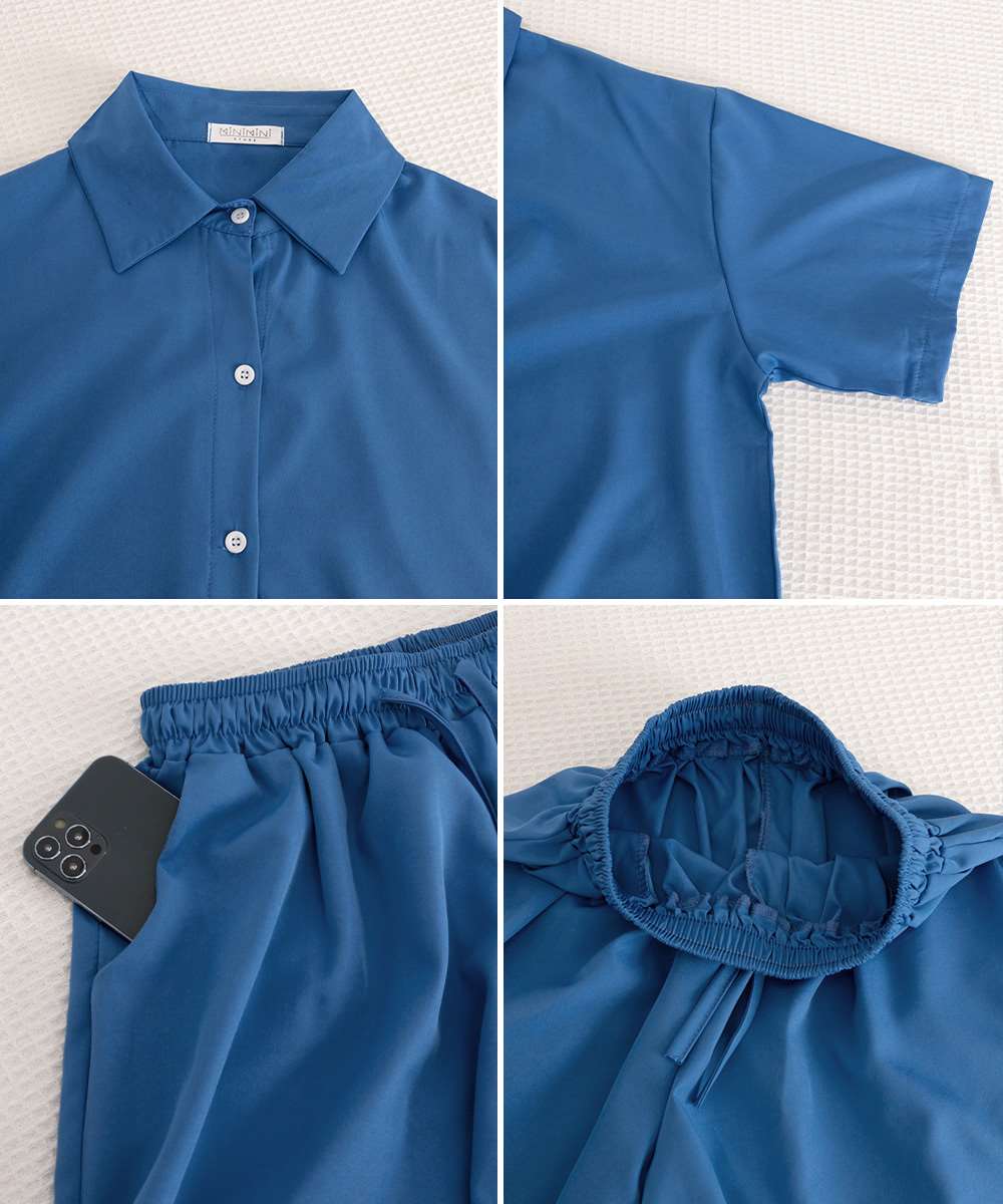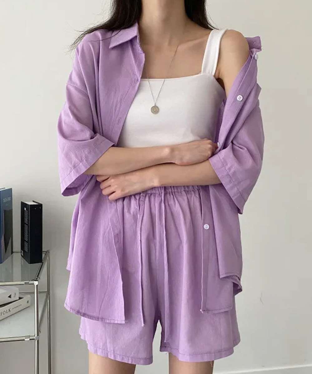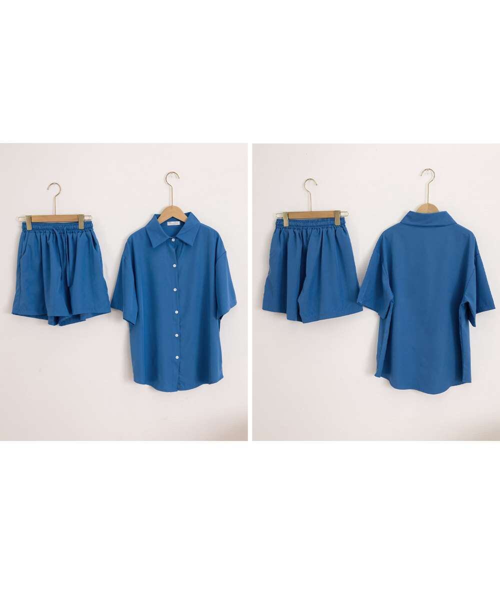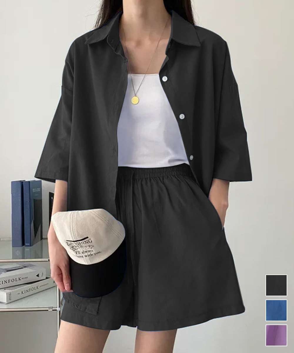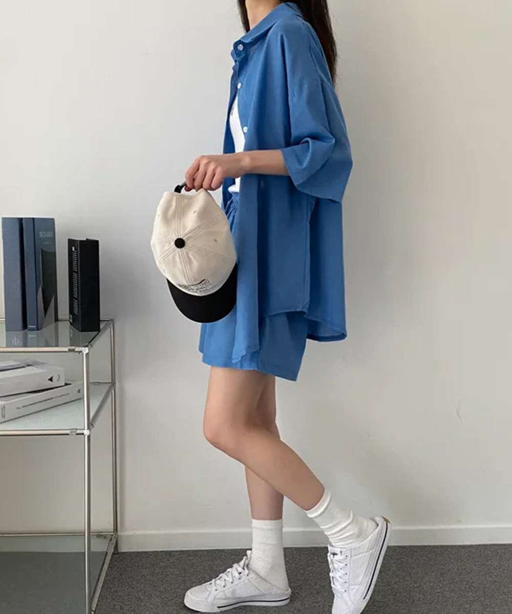 半袖シャツとショートパンツのカジュアルセットアップ。