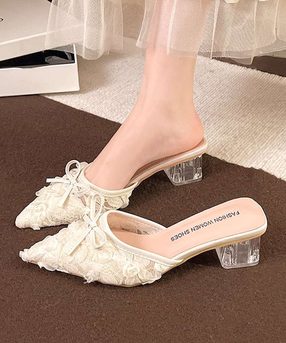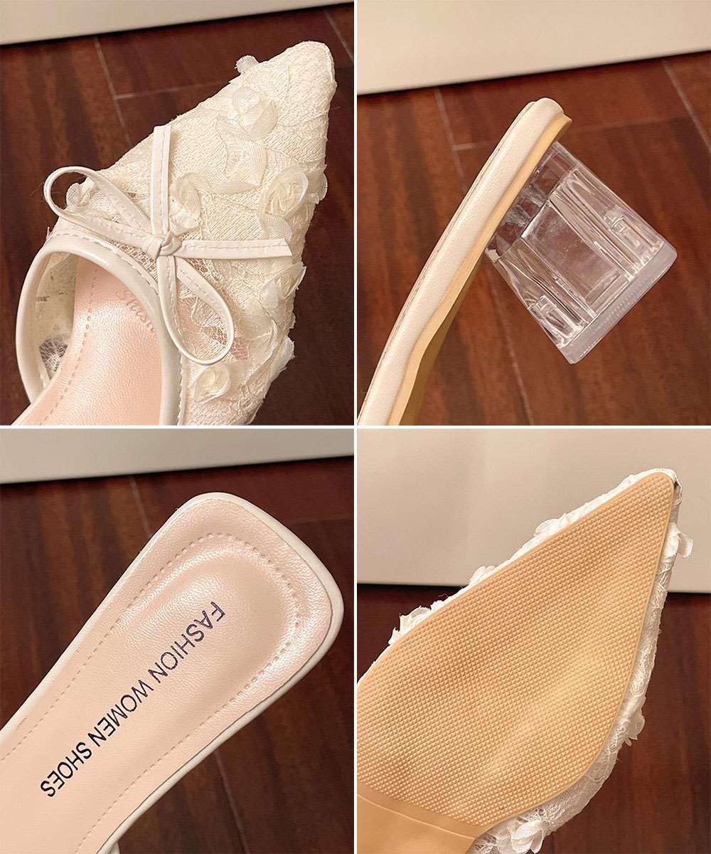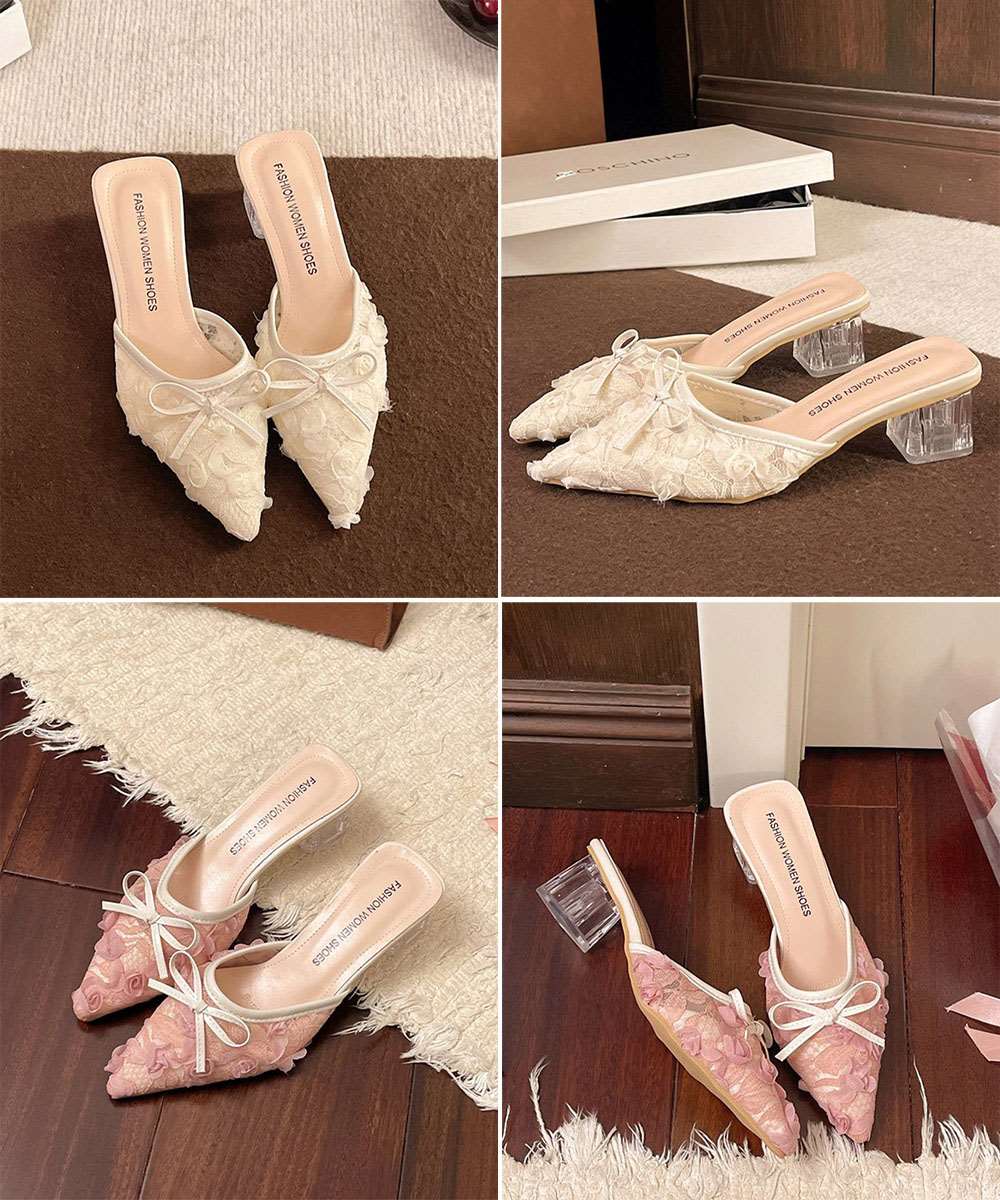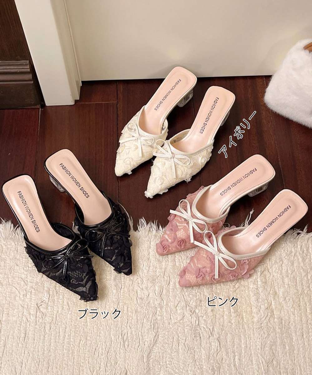 ポインテッドトゥとリボンデザインが魅力のレディースミュールサンダル。