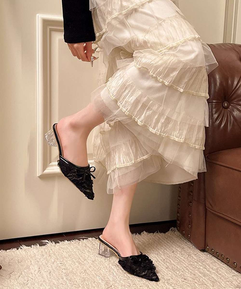 キーワード:美脚見えミュール クリアヒール抜け感 パーティーミュール